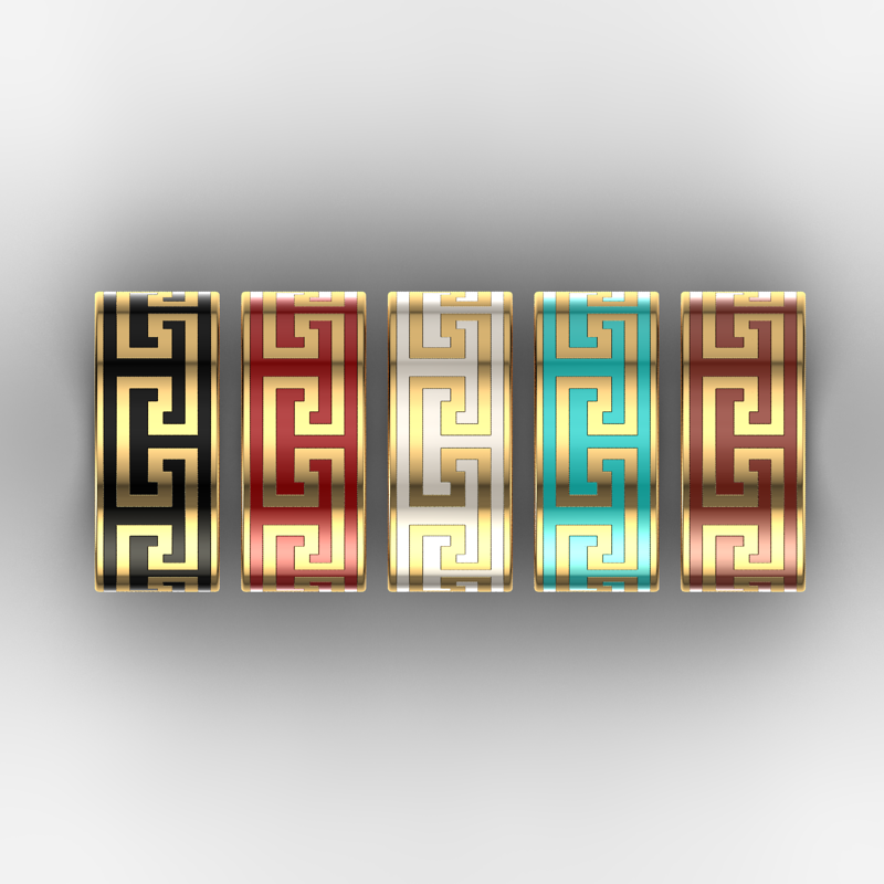 Gold and Ceramic. Width: 7.5mm Vast Choice of Ceramic Colors. Available in white gold, yellow gold, rose gold, 10K,14K,18K and platinum. Please contact us for pricing and more information.