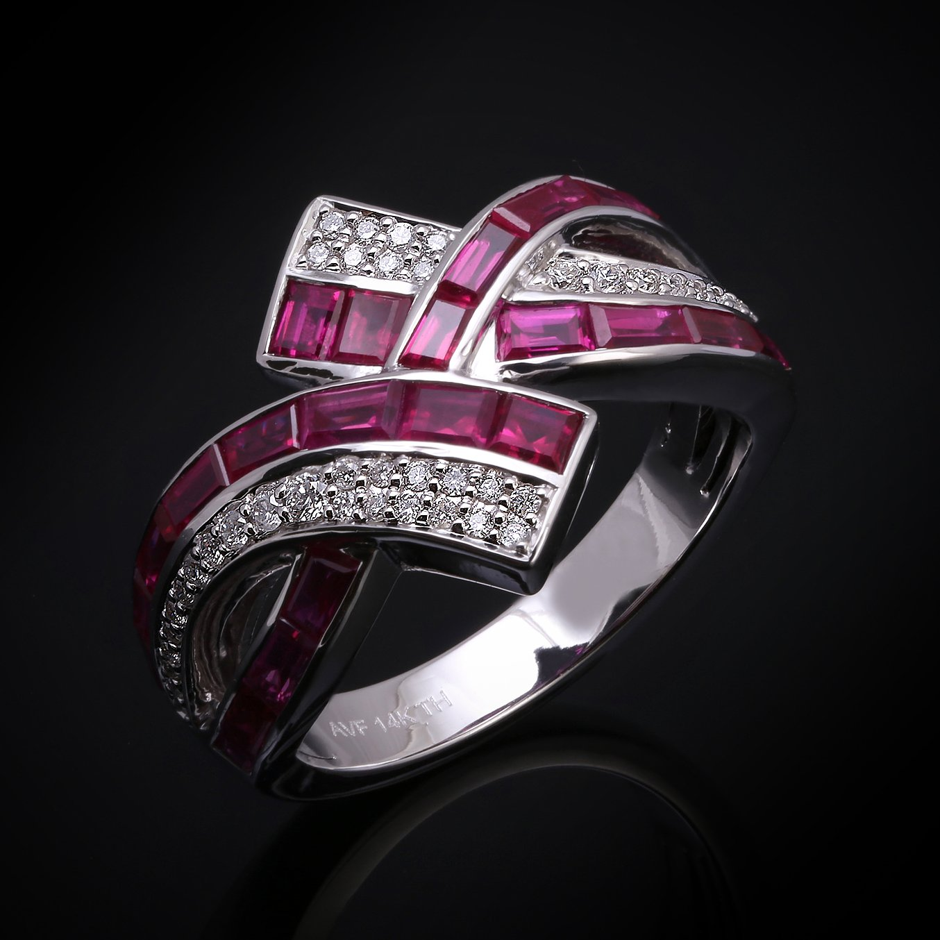 Ring Metal: 14K White Gold Weight: 6.08 grams Main Stone: Tapered Baguette Ruby with a total weight of 5 carats. Round Diamonds with a total weight of 0.21 carat.