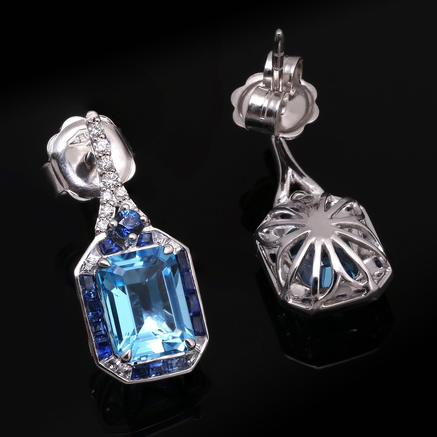 Earrings Metal: 14K White Gold Weight: 3.38 grams Main Stone: 8X6mm Emerald Cut Swiss Blue Topaz with a total weight of 5.63 carats. Accent Stones: 2.30 mm Round Blue Sapphire with a total weight of 0.12 carat. Tapered Baguette White Sapphire with a total weight of 1.00 carat. Round Diamonds with a total weight of 0.15 carat.