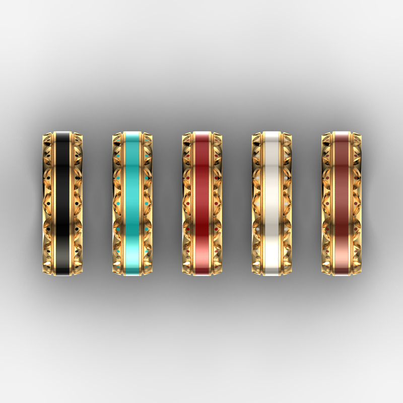 Gold and Ceramic. Vast Choice of Ceramic Colors. Available in white gold, yellow gold, rose gold, 10K,14K,18K and platinum. Please contact us for pricing and more information.