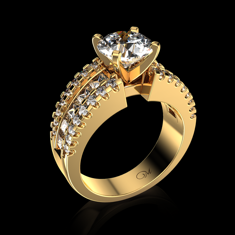 Center Stone: Brilliant-Cut Diamond 1ct. Accent Stones: 32 Brilliant-Cut Diamonds 10 Princess-Cut Diamonds. Available in white gold, yellow gold, rose gold, 10K,14K,18K and platinum. Please contact us for pricing and more information.