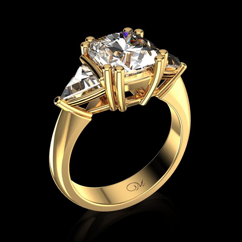Center Stone: Cushion-Cut 7.5mm Side Stones: Triangle 5x5.6mm Available in white gold, yellow gold, rose gold, 10K,14K,18K and platinum. Please contact us for pricing and more information.